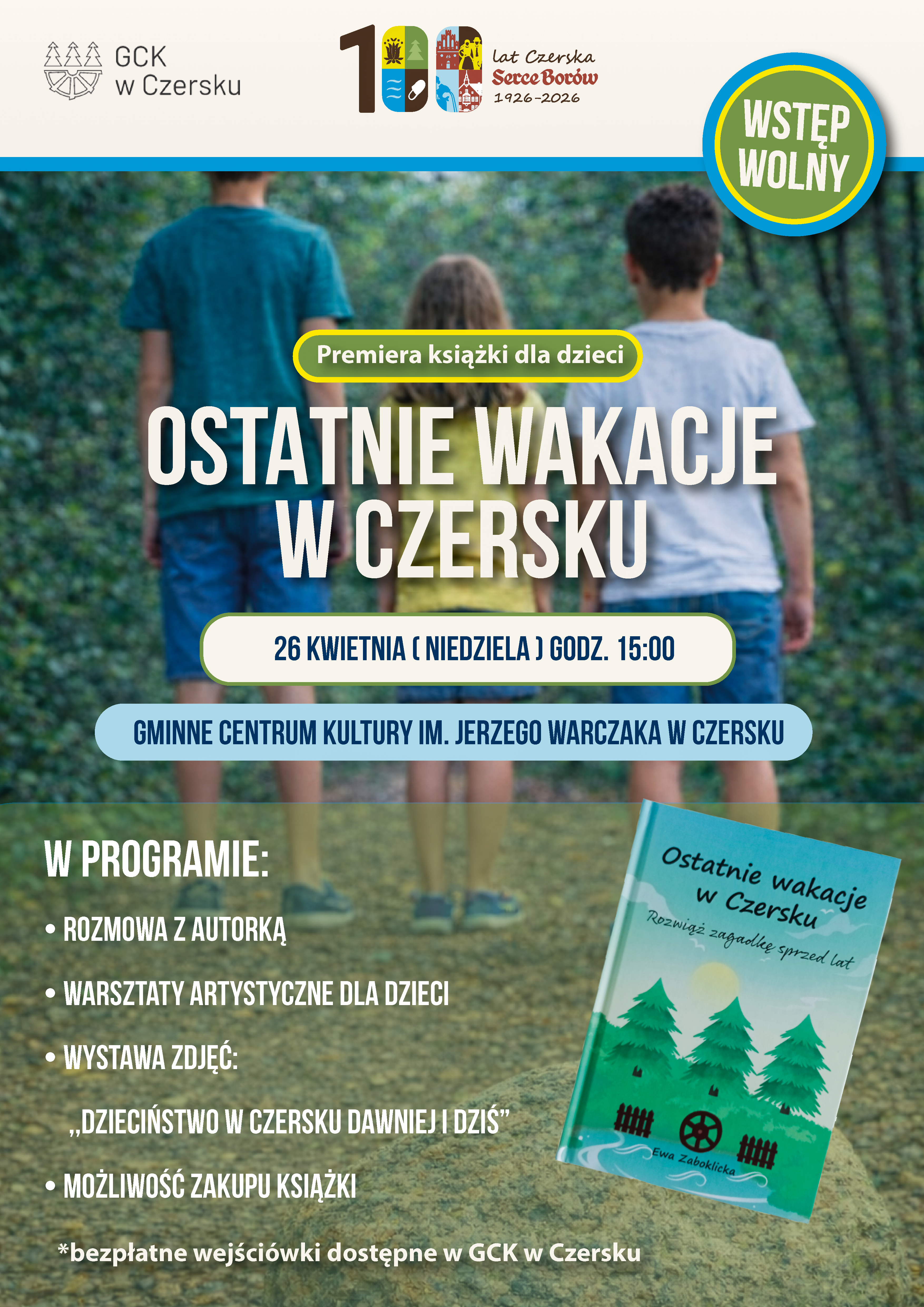„Ostatnie wakacje w Czersku” to książka przygodowa skierowana do młodszych czytelników, łącząca współczesność z historią miasta. Fabuła opowiada o trójce dzieci spędzających wakacje w Czersku, których plany zmienia odnalezienie tajemniczego listu sprzed wojny. Znalezisko staje się początkiem podróży w przeszłość, pełnej zagadek, emocji i refleksji nad pamięcią, przyjaźnią oraz tożsamością. Publikacja została wzbogacona o mini grę terenową, umożliwiającą czytelnikom aktywne poznawanie historii przedstawionej w książce. W programie wydarzenia zaplanowano spotkanie z autorką, warsztaty artystyczne dla dzieci oraz wystawę fotografii „Dzieciństwo w Czersku dawniej i dziś”. Na miejscu będzie również możliwość zakupu książki. Wstęp na wydarzenie jest bezpłatny. Wejściówki dostępne są w Gminnym Centrum Kultury w Czersku. Link do wydarzenia na Facebooku: Premiera książki dla dzieci "OSTATNIE WAKACJE W CZERSKU".