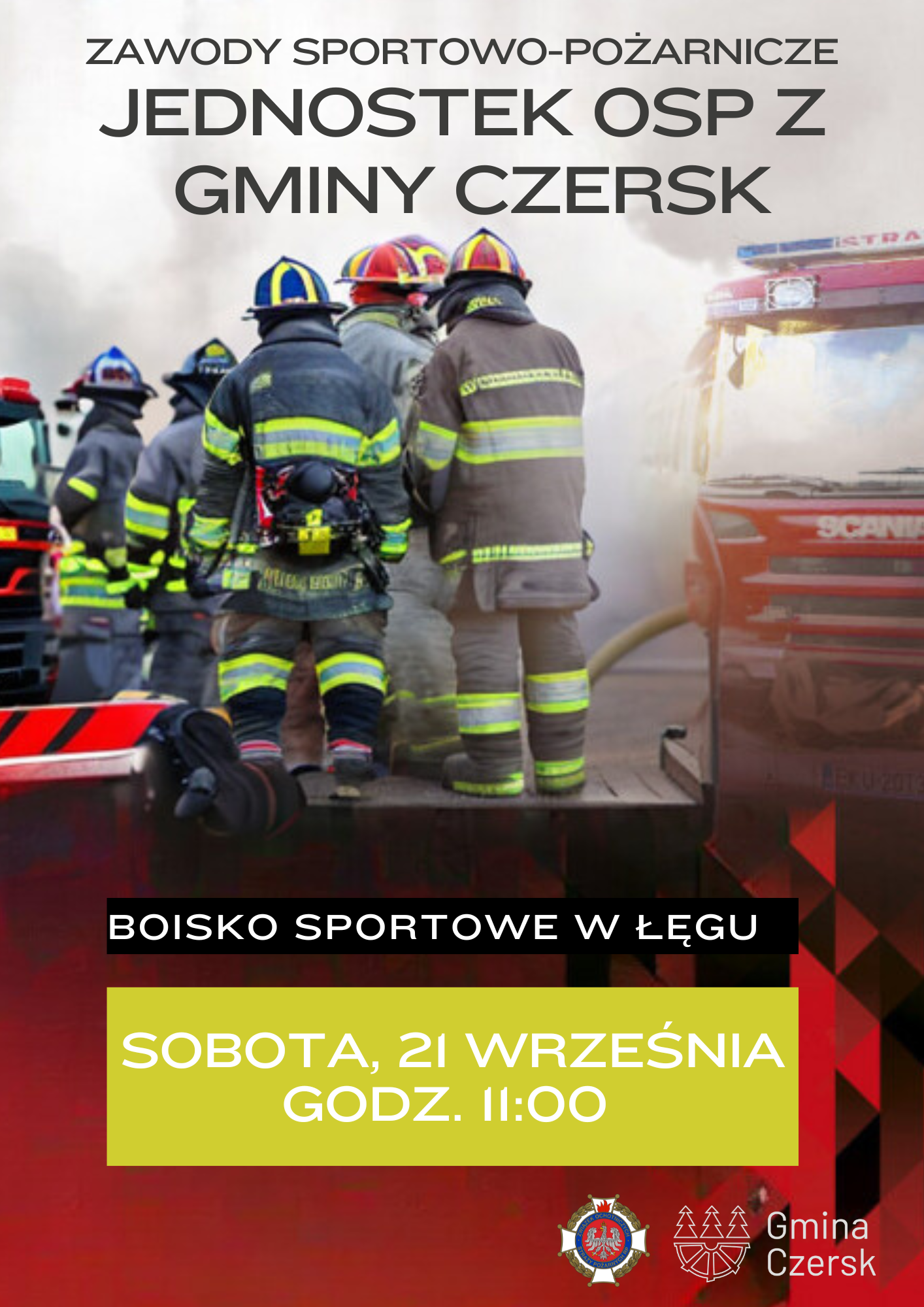 W sobotę, 21 września, na boisku w Łęgu, odbędą się Zawody Sportowo-Pożarnicze jednostek Ochotniczych Straży Pożarnych z Gminy Czersk!